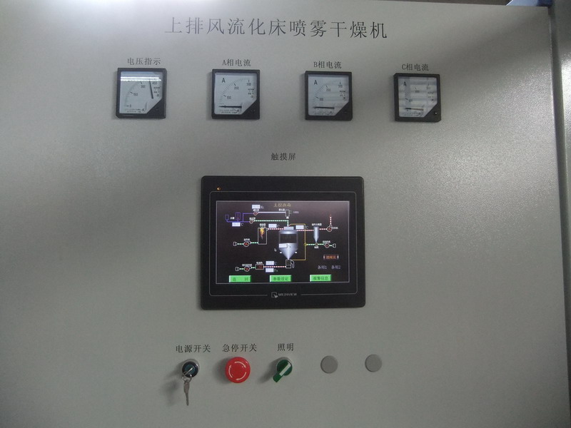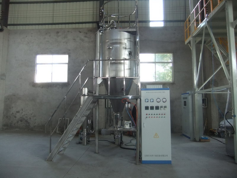 操作模式:從霧化噴嘴(二流體霧化噴嘴或壓力霧化噴嘴)安裝在干燥室頂部中心進料噴霧,熱氣體通過熱風分配器進入;