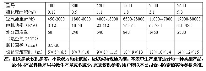 圓形連續噴霧流化造粒機系列技術參數表: